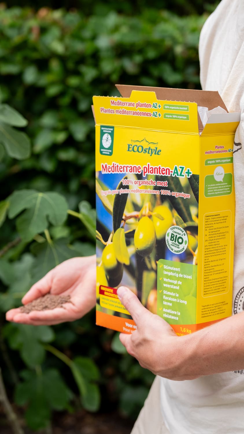 Unieke organische mest, afgestemd op Mediterrane planten en verrijkt met micro-organismen.